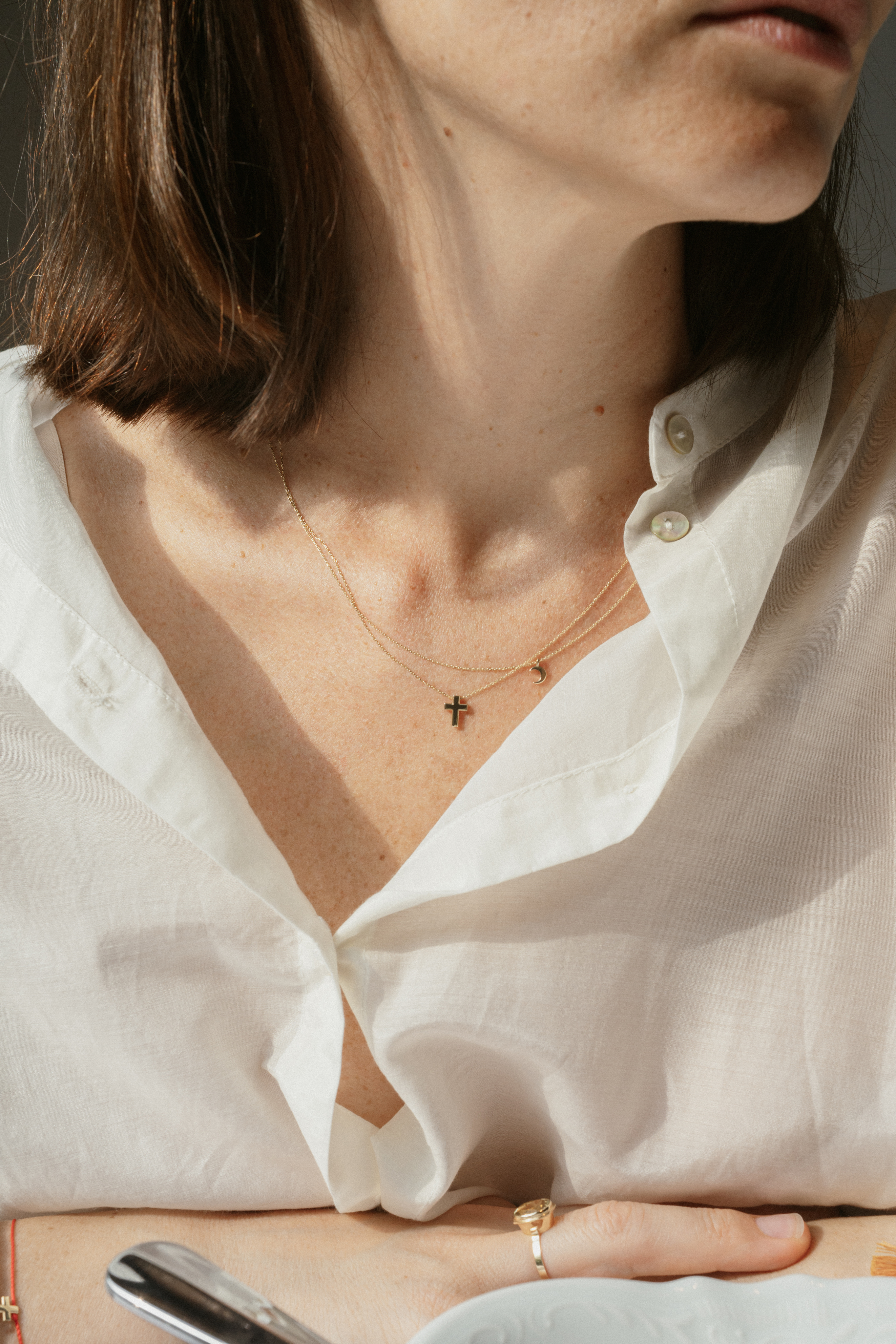 изначально я делала его представляя в подвеске на шее, однако когда украшение было закончено, оказалось что крестик идеально вписывается в любой браслет, как золотая деталь. его можно интегрировать в совершенно разные украшения.