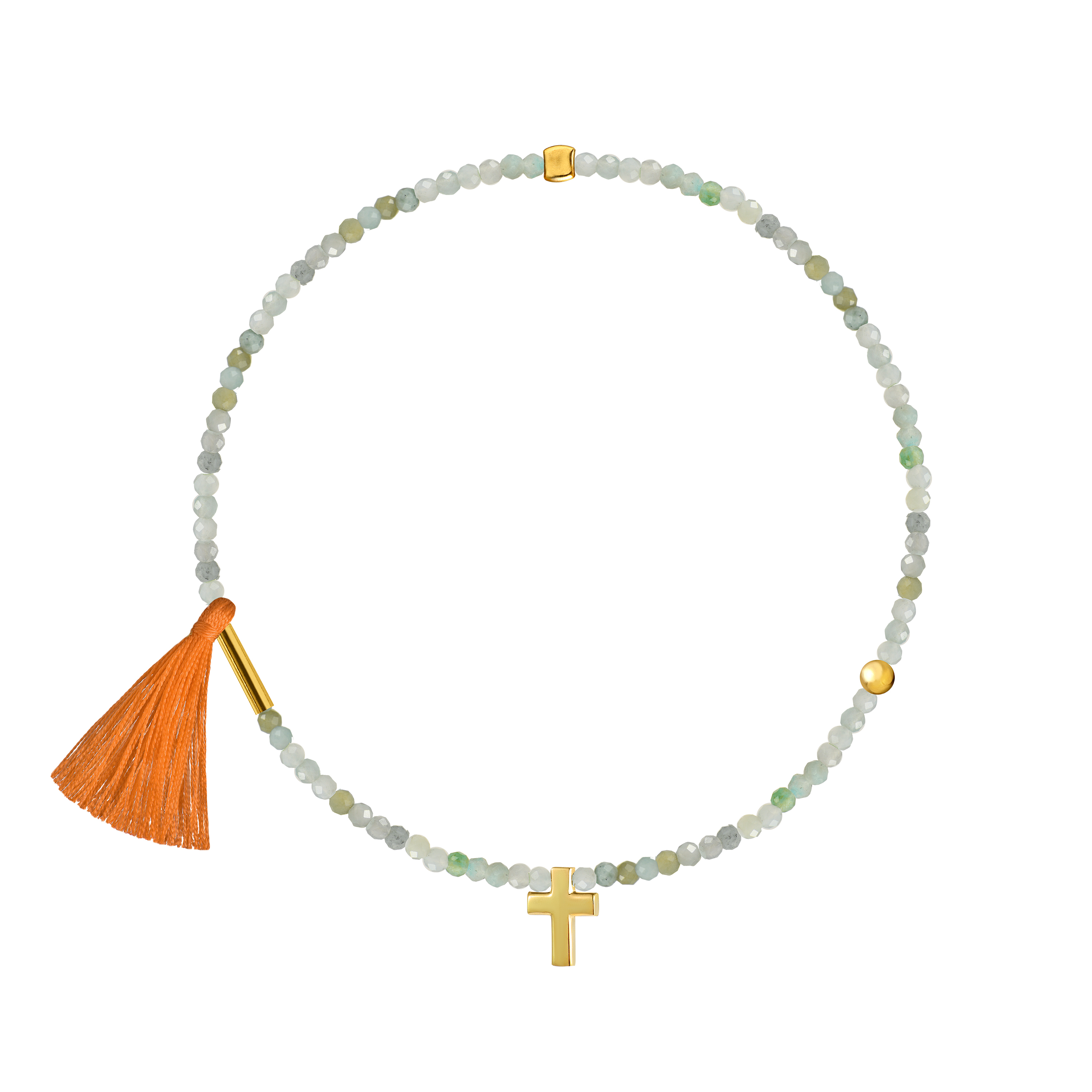 браслет из амазонита, желтого золота 585, кисти тыквенного цвета из японской нити на суперпрочной резинке находится в хлопковом конверте (идеальном для хранения украшения в дороге) внутри фирменной коробочки