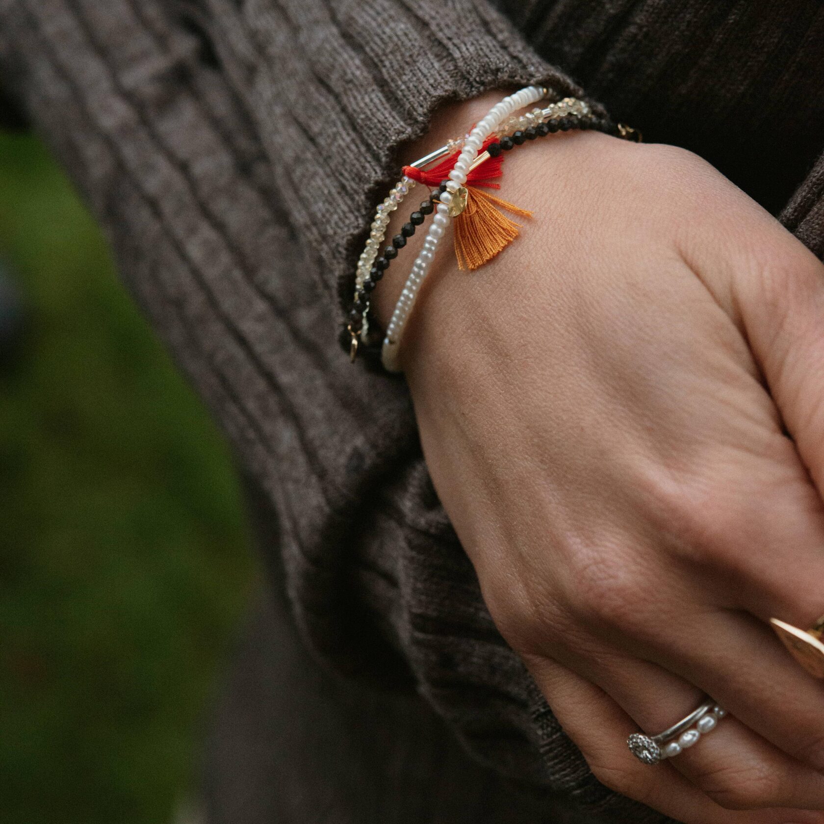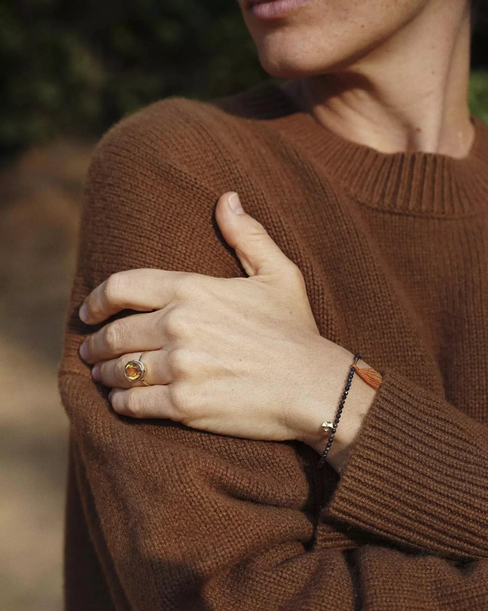 браслет из опалов шоколадно-земляного цвета с мятым листом