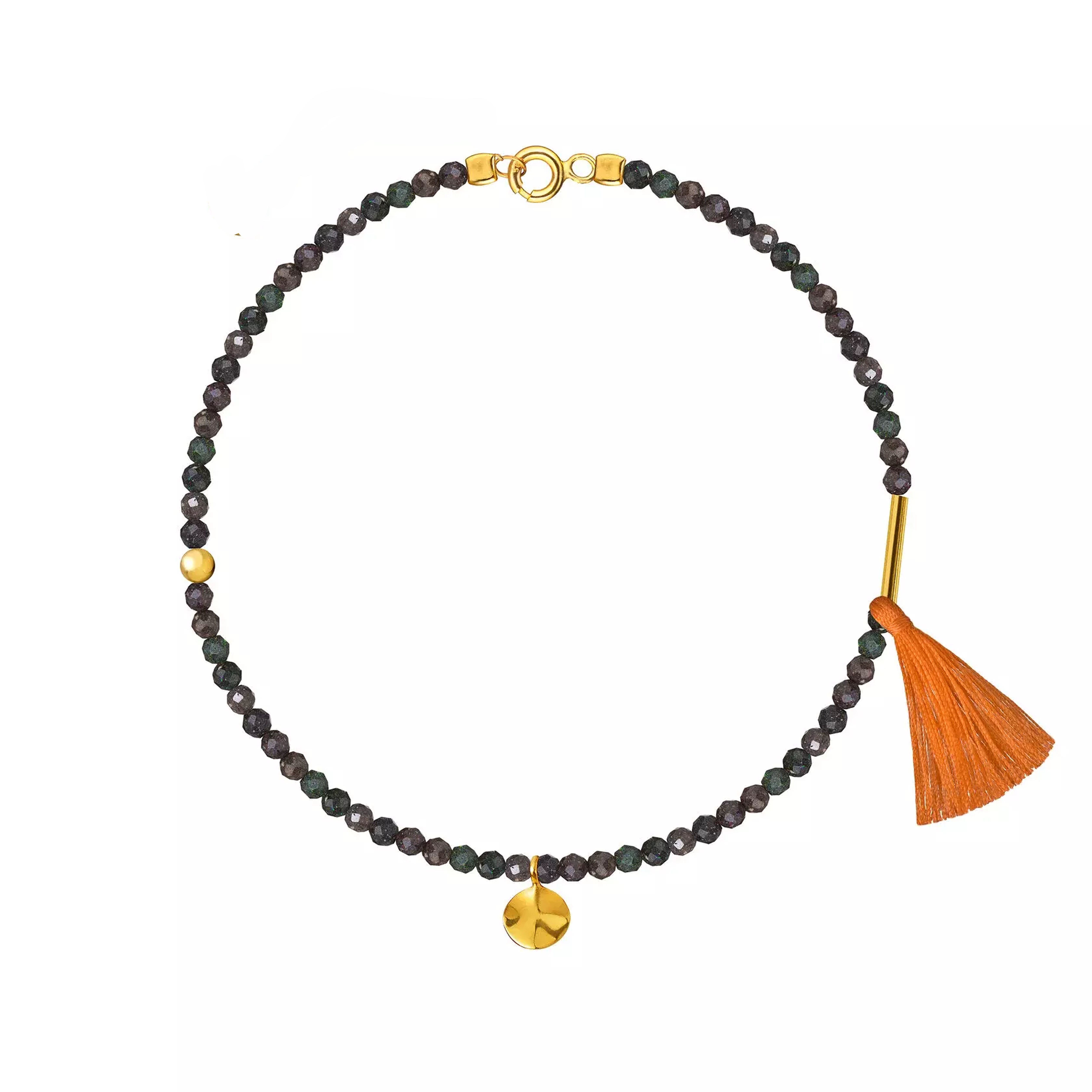 браслет из темных коричневых опалов 2.5 мм с подвеской «мятый лист» и деталями из желтого золота 585 нанизан на ювелирный тросик и застегивается замком на 16 сантиметров. браслет находится в квадратной тканевой коробке, внутри – цветы, которые я, анна масловская, привожу из путешествий по разным странам.