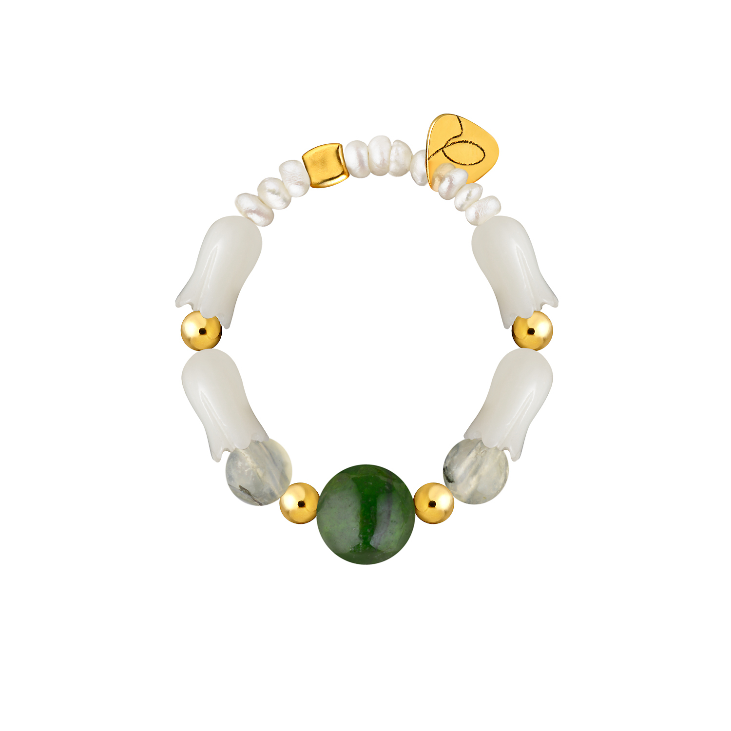 кольцо на суперпрочной резинке из нефрита, жёлтого золота 585, лабрадора, коралла и жемчуга в хлопковом тканевом конверте (идеальном для хранения украшения в дороге) внутри мешочка. кольцо может быть изготовлено в другом размере, в таком случае его дизайн немного изменится.