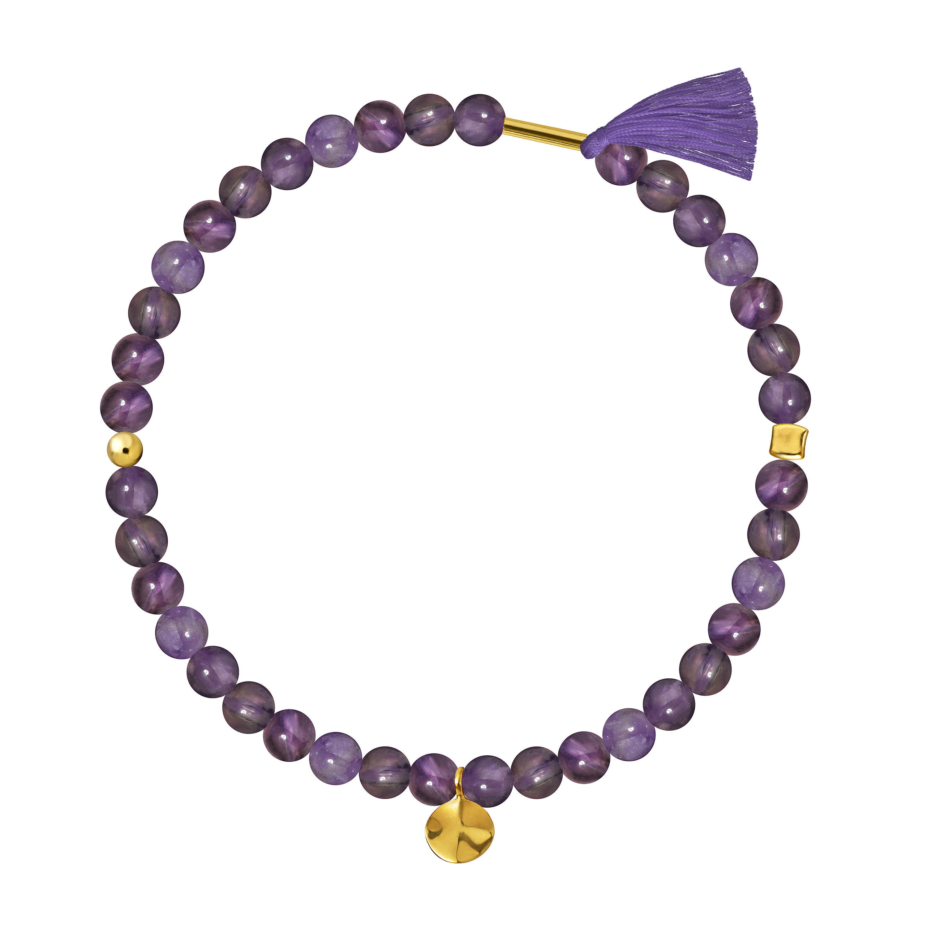 браслет из аметиста (4 мм), желтого золота 585, фиолетовой кисти из японской нити на суперпрочной резинке находится в хлопковом тканевом конверте (идеальном для хранения украшения в дороге) внутри мешочка.