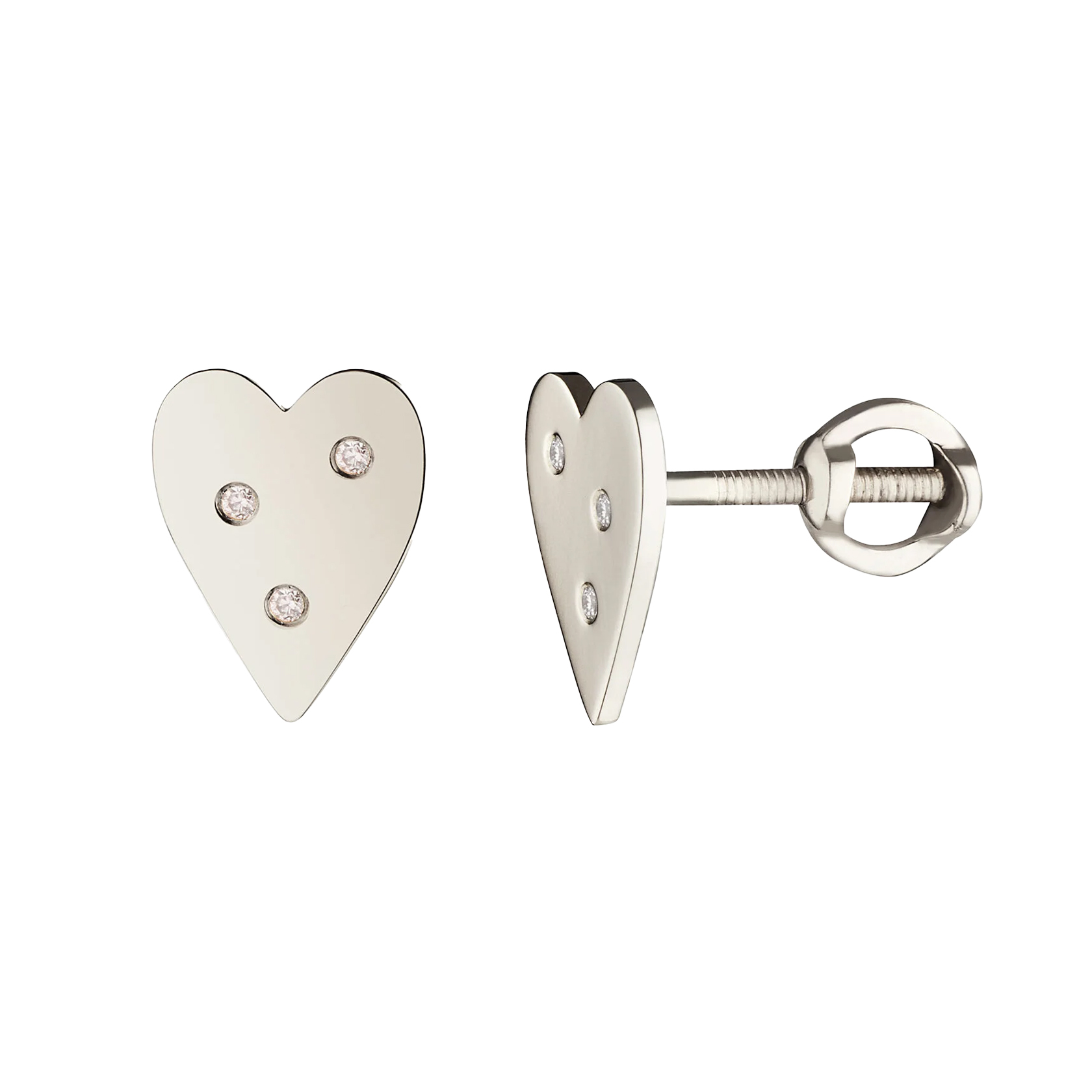 серьги (пара) «сердце» с тремя бриллиантами из белого золота