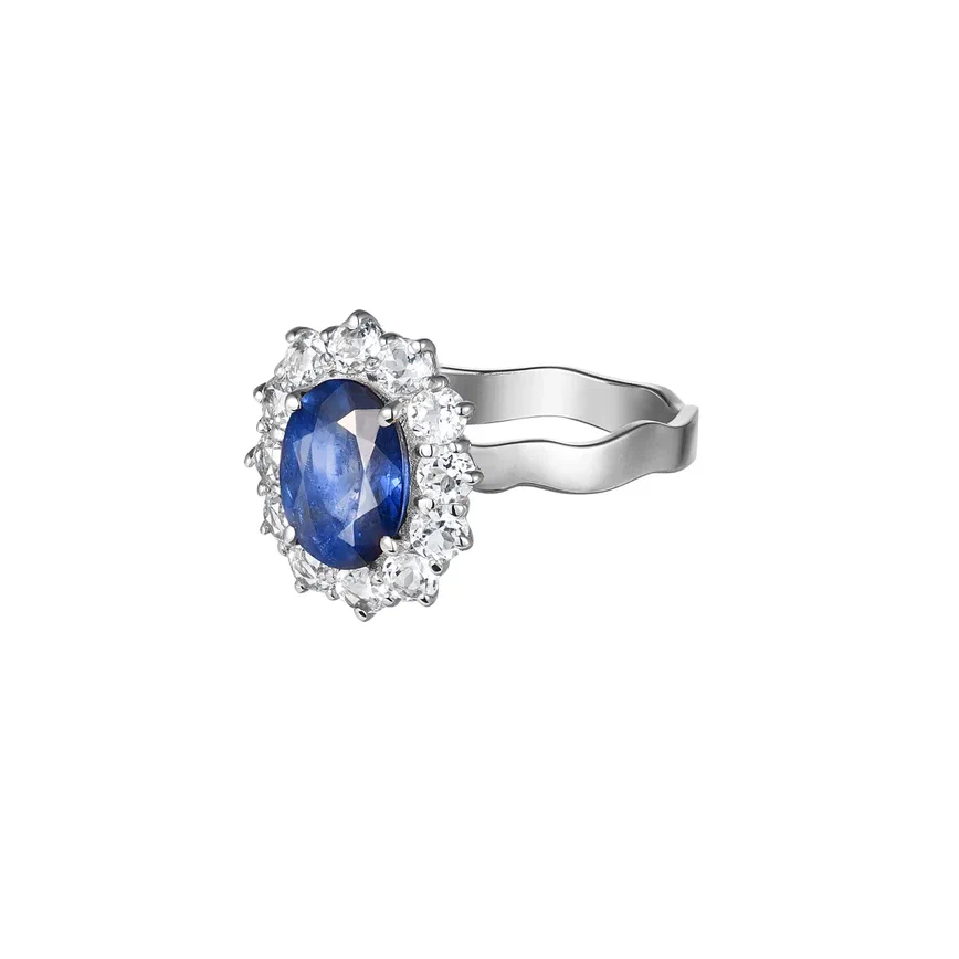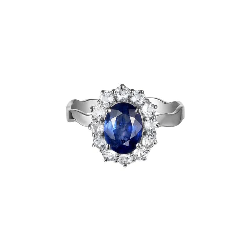 белое золото 585, сапфир природный облагороженный овальной формы 1,42 карата, 12 природных белых топазов диаметром 2.5 мм
