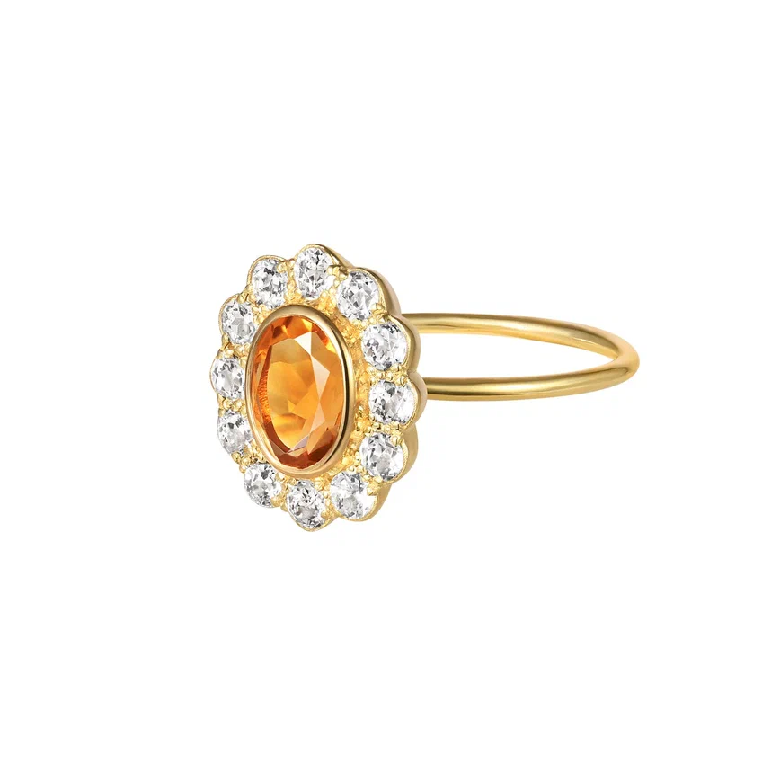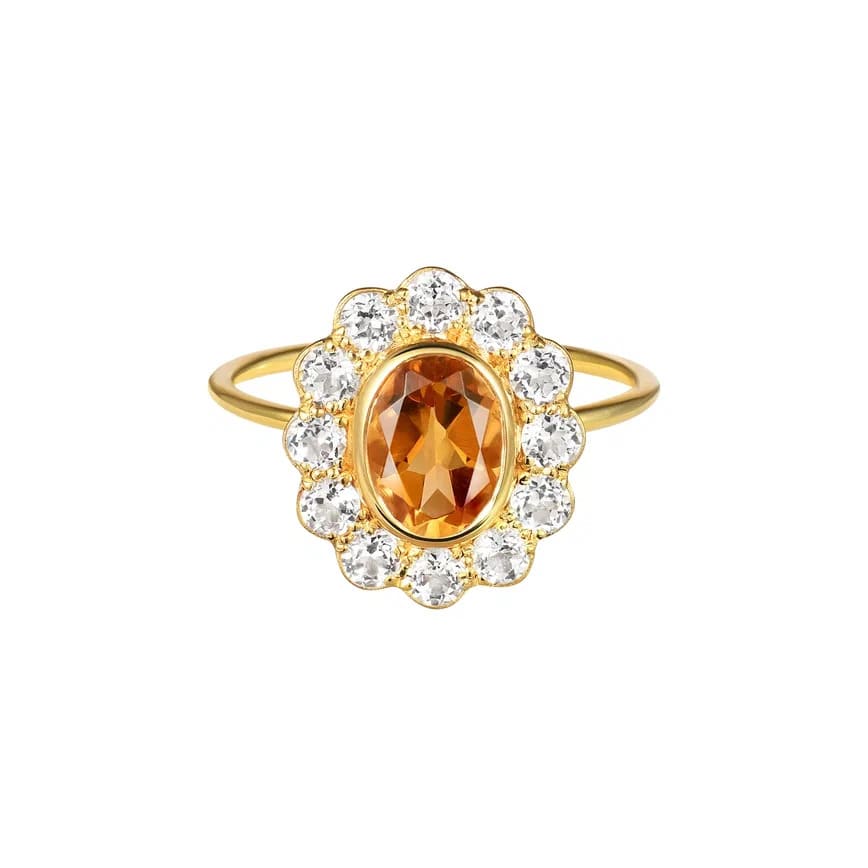 желтое золото 585, цитрин овальной формы, 12 природных белых топазов диаметром 2.5 мм