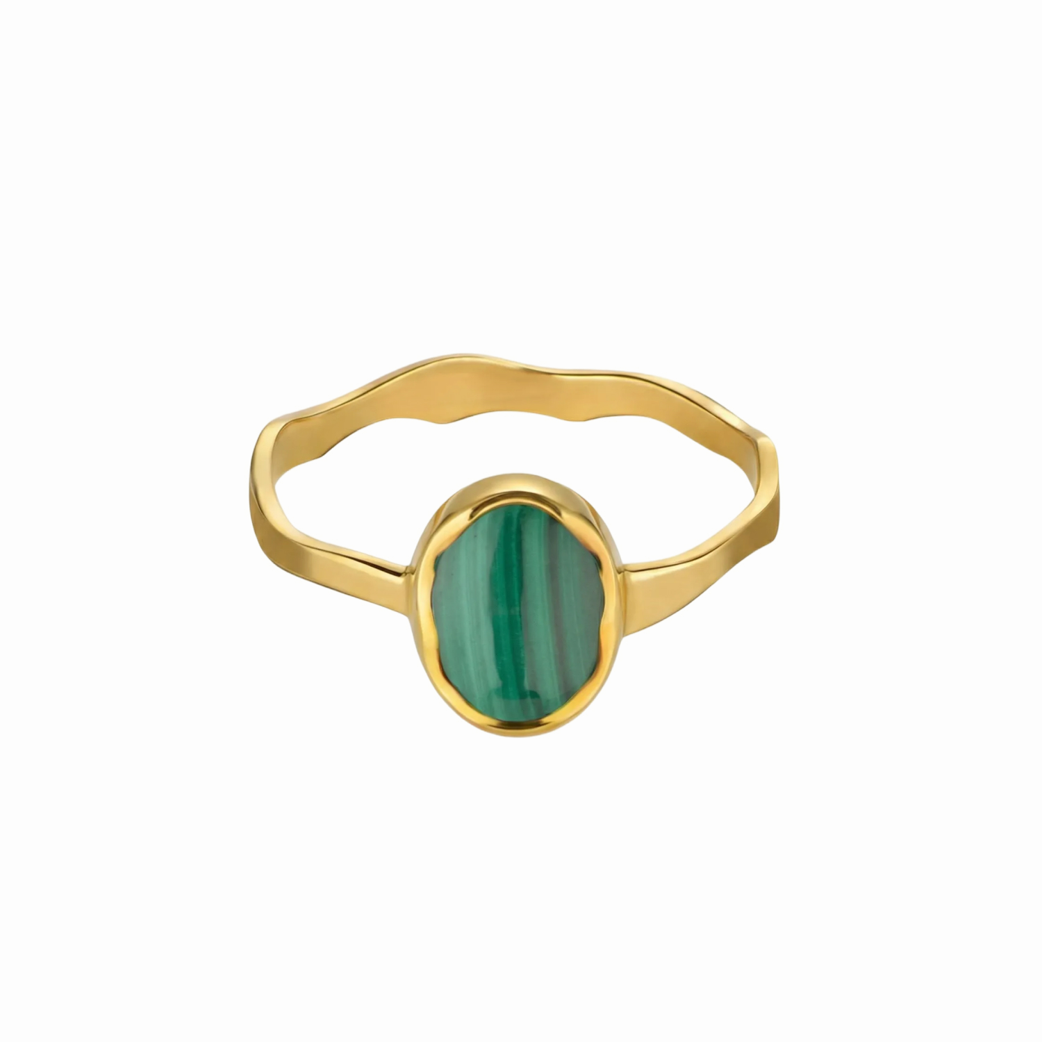 желтое золото 585, малахит, кольцо находится в шкатулке из оникса, упакованной по японскому методу фуросики в платок из хлопка.