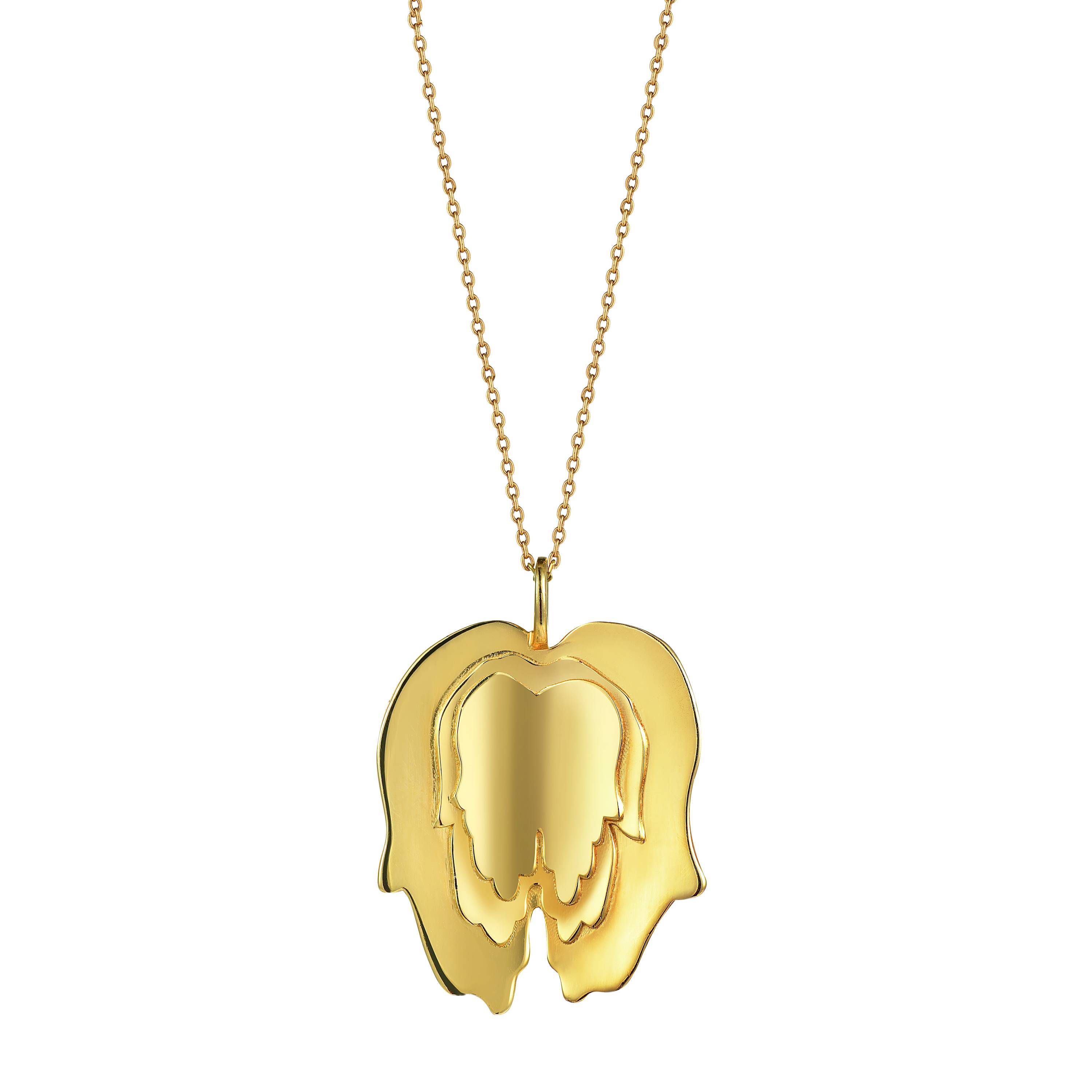 подвеска в форме ладоней из жёлтого золота на цепочке длиной 45. колье находится в шкатулке из оникса, упакованной по японскому методу фуросики в платок из хлопка.
