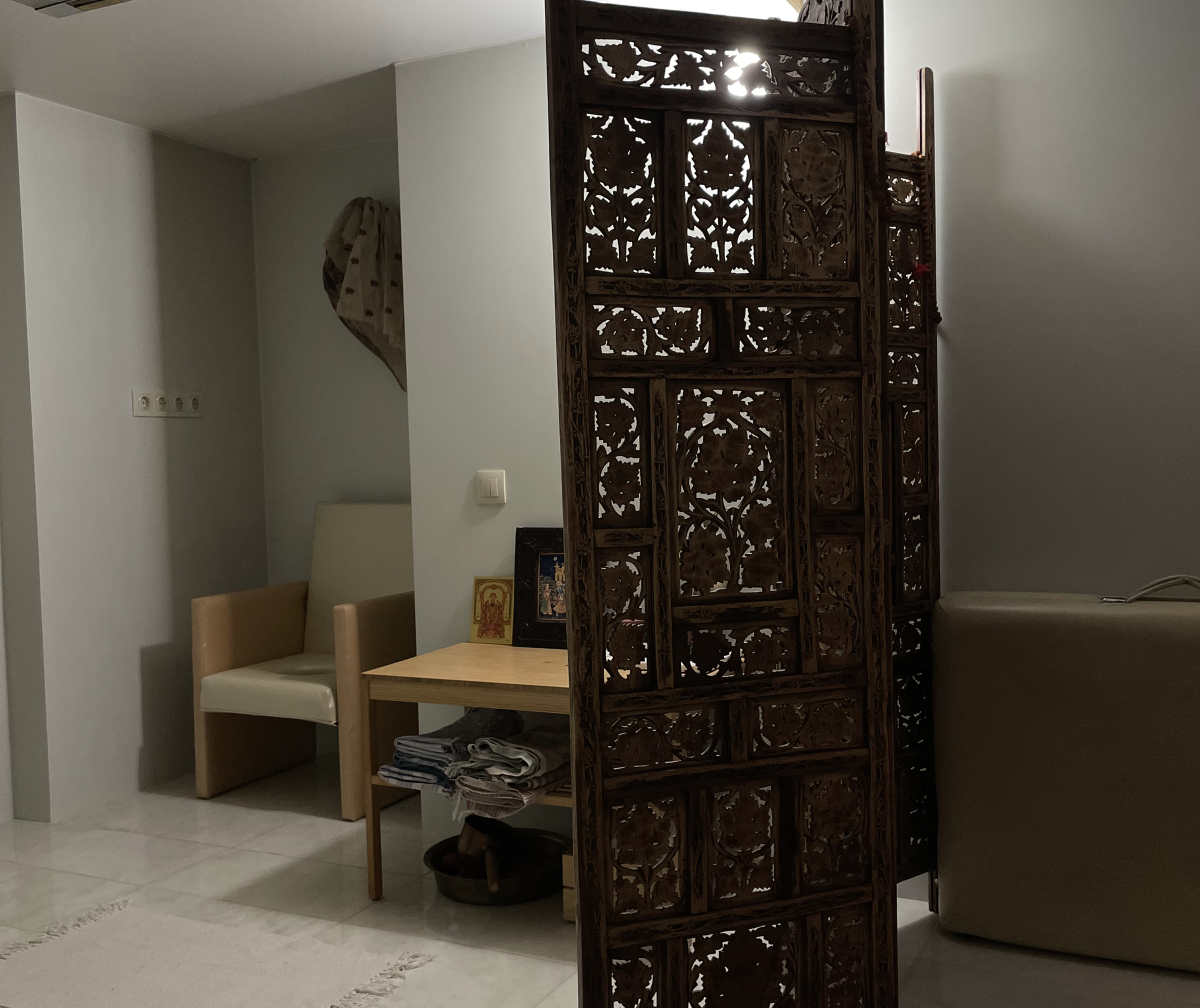 устройство: 15 кв. метров на северо-западе храма, окно с дневным светом с плотной белой занавеской, два кресла, массажный стол, футон, стол, стеллаж, восковые свечи.