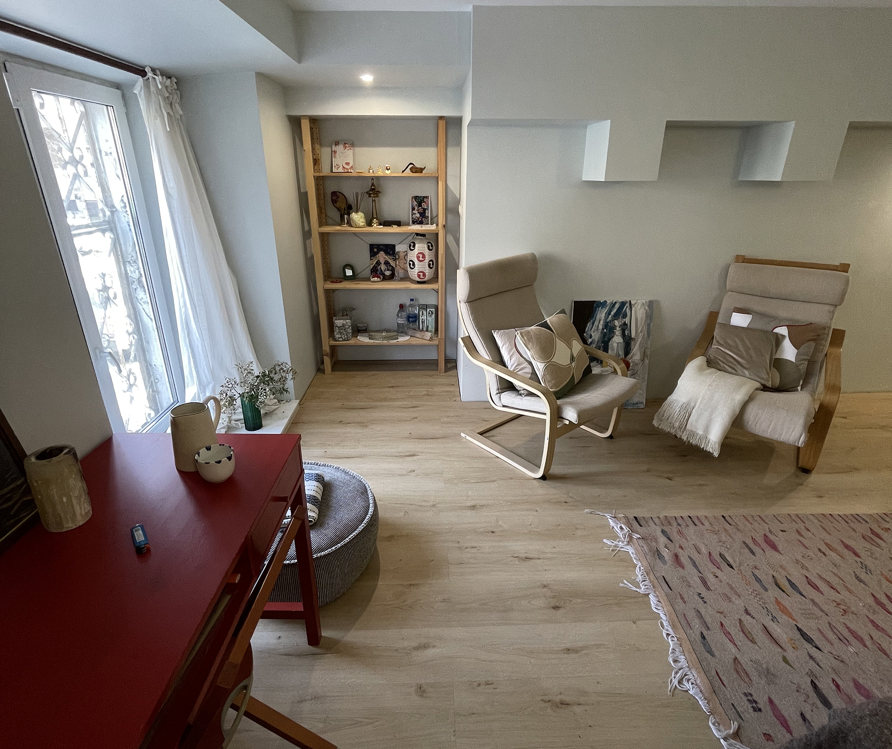 Кабинет на втором этаже с окном, светлый и воздушный, больше подойдет для энергетических тонких практик и терапии без прикосновений к телу, для этого здесь находятся два удобных кресла. Обычно здесь принимает остеопат и проходят телесные терапии без использования масла. Место подходит так же для проведения индивидуальных расстановок и процессов терапии через работу с сознанием и подсознанием.